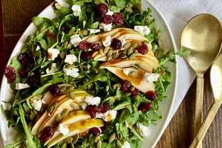 …arugula and pear salad with figgy balsamic dressing & tahini rice krispie treats
