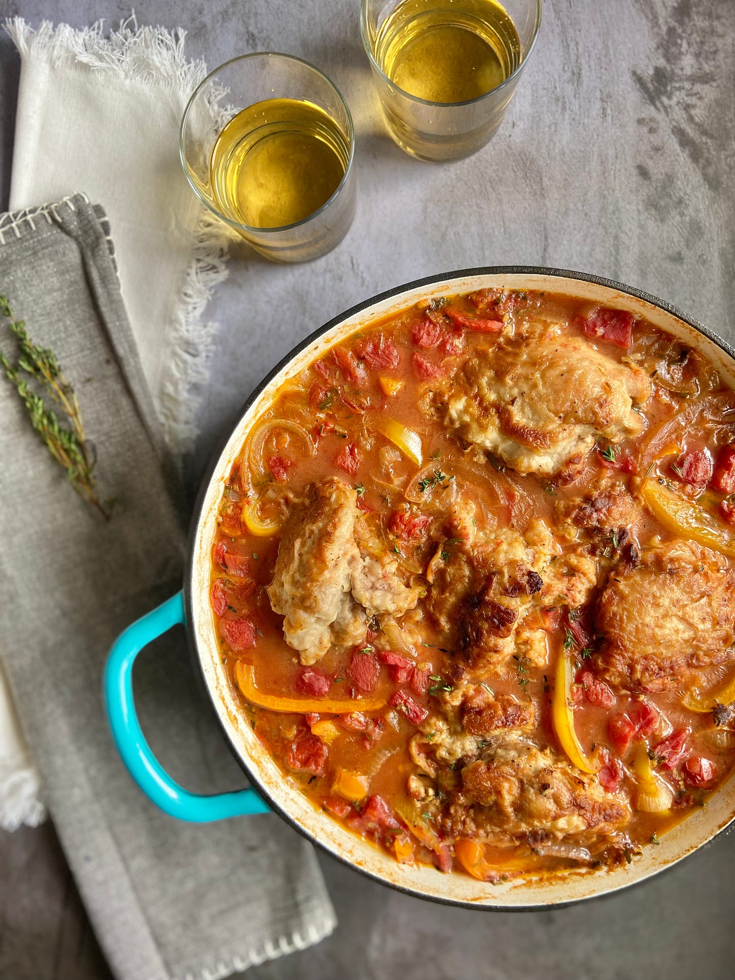 In my vision of this Chicken Cacciatore as a holiday dinner, I would bring the pan right to the table and let guests serve themselves the tender chicken and savory sauce over bowls of creamy polenta with a mixed greens salad on the side and plenty of rustic bread for swiping all around the plates.